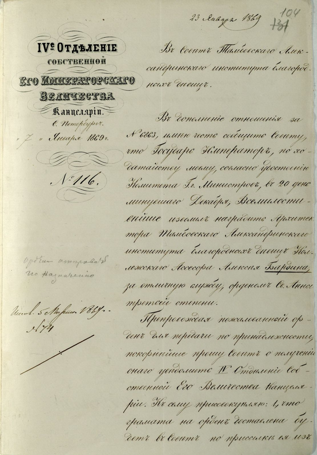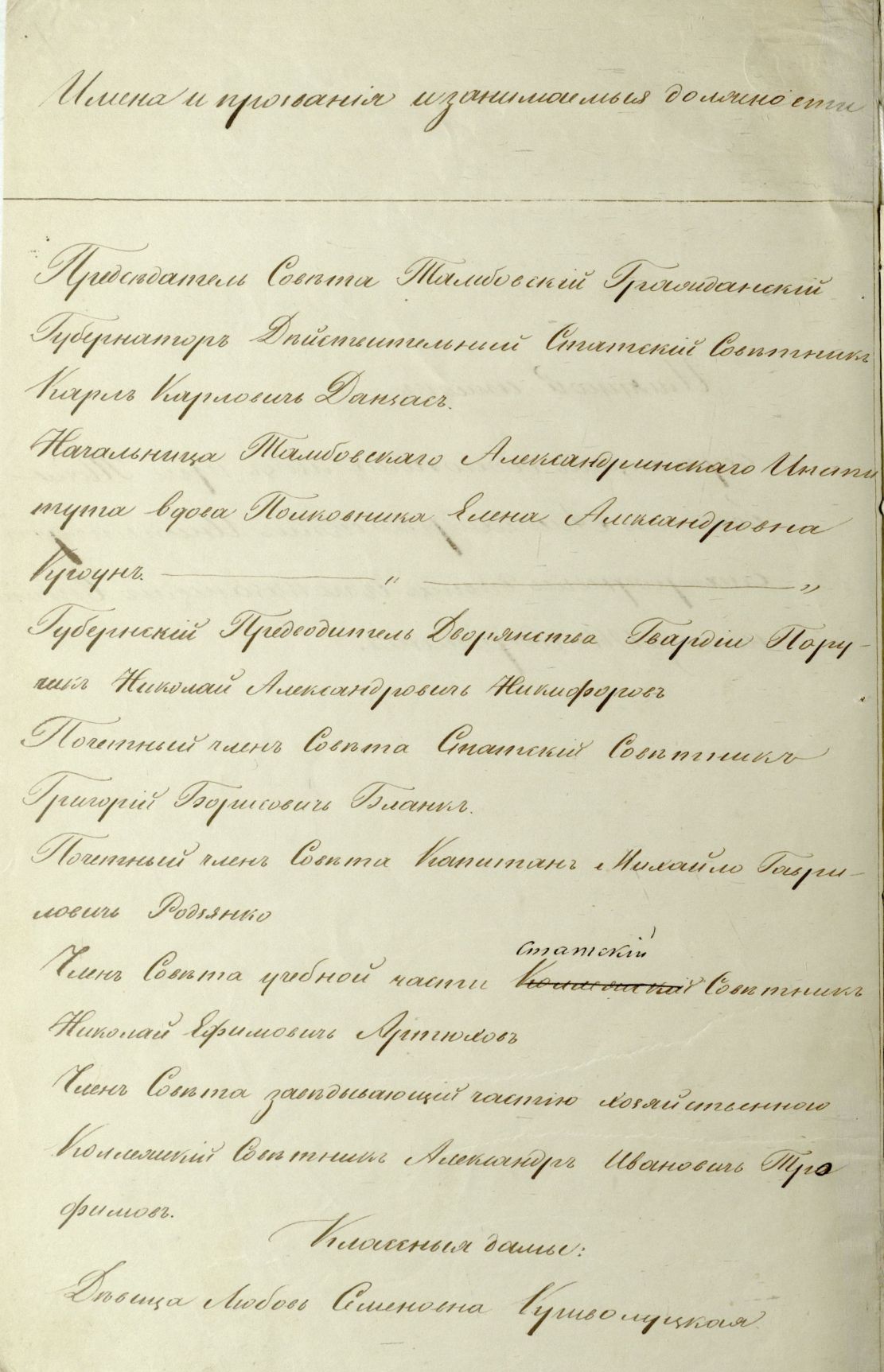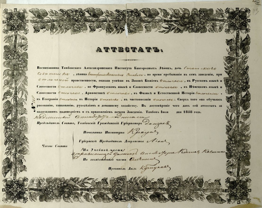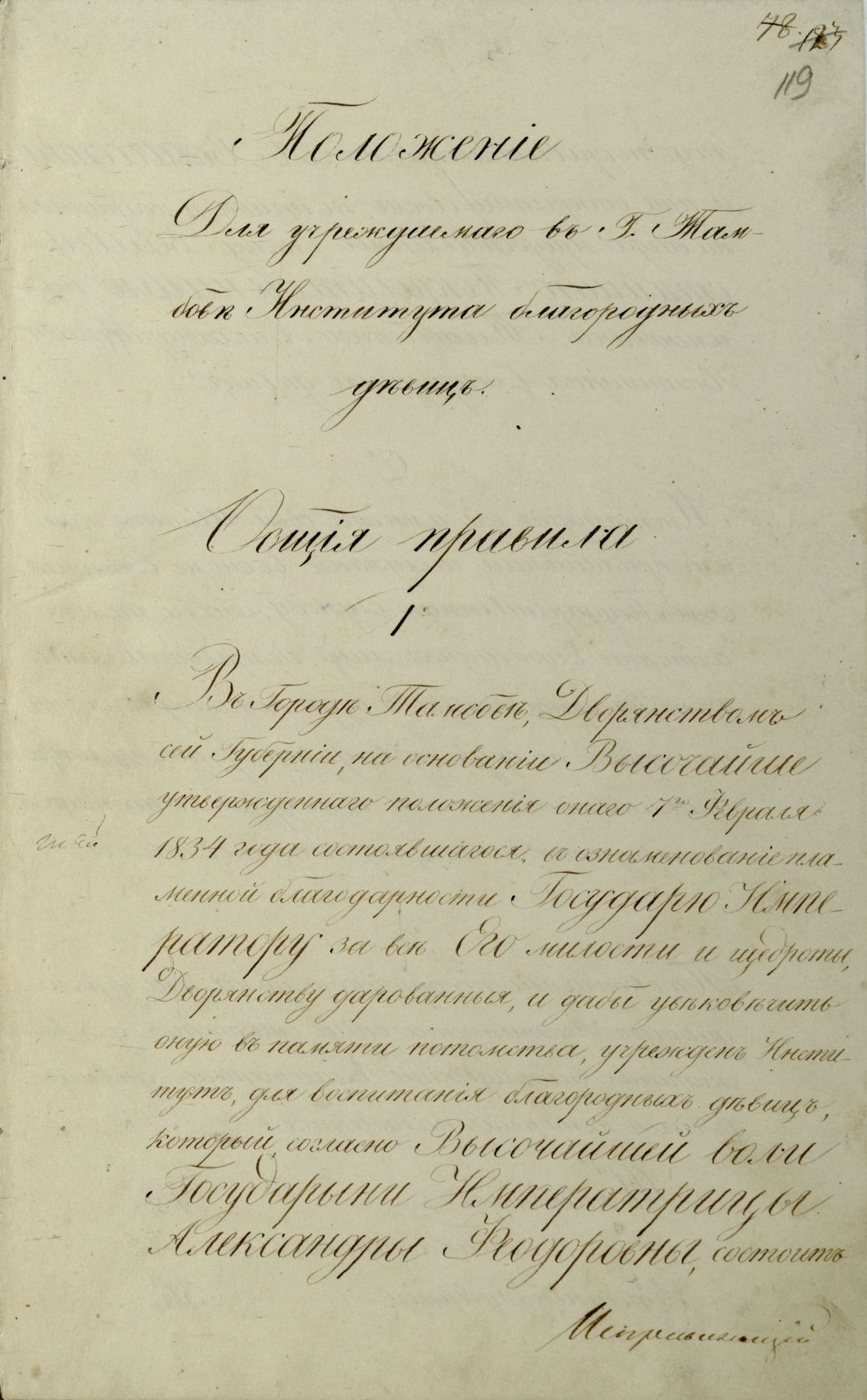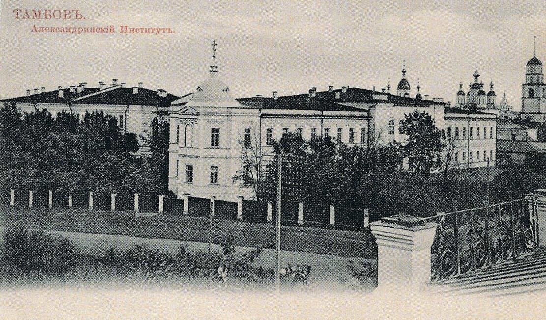 Тамбовский Александринский институт благородных девиц был основан по решению Тамбовского дворянского собрания, состоявшегося в 1834 году. Денежные средства для его учреждения должны были складываться из пожертвований дворян. Но от принятия решения до его воплощения – не короткий путь. Деньги собирались довольно долго, в течение шести лет. В 1836 году Тамбов посетил император Николай I и пожаловал в дар институту усадьбу старого губернаторского дома, который помнил ещё пребывание в нём правителя Тамбовского наместничества Гавриила Романовича Державина. Строительство института началось в 1840 году и закончилось только в 1843. Одновременно был разбит большой сад, в котором воспитанницы института могли гулять.