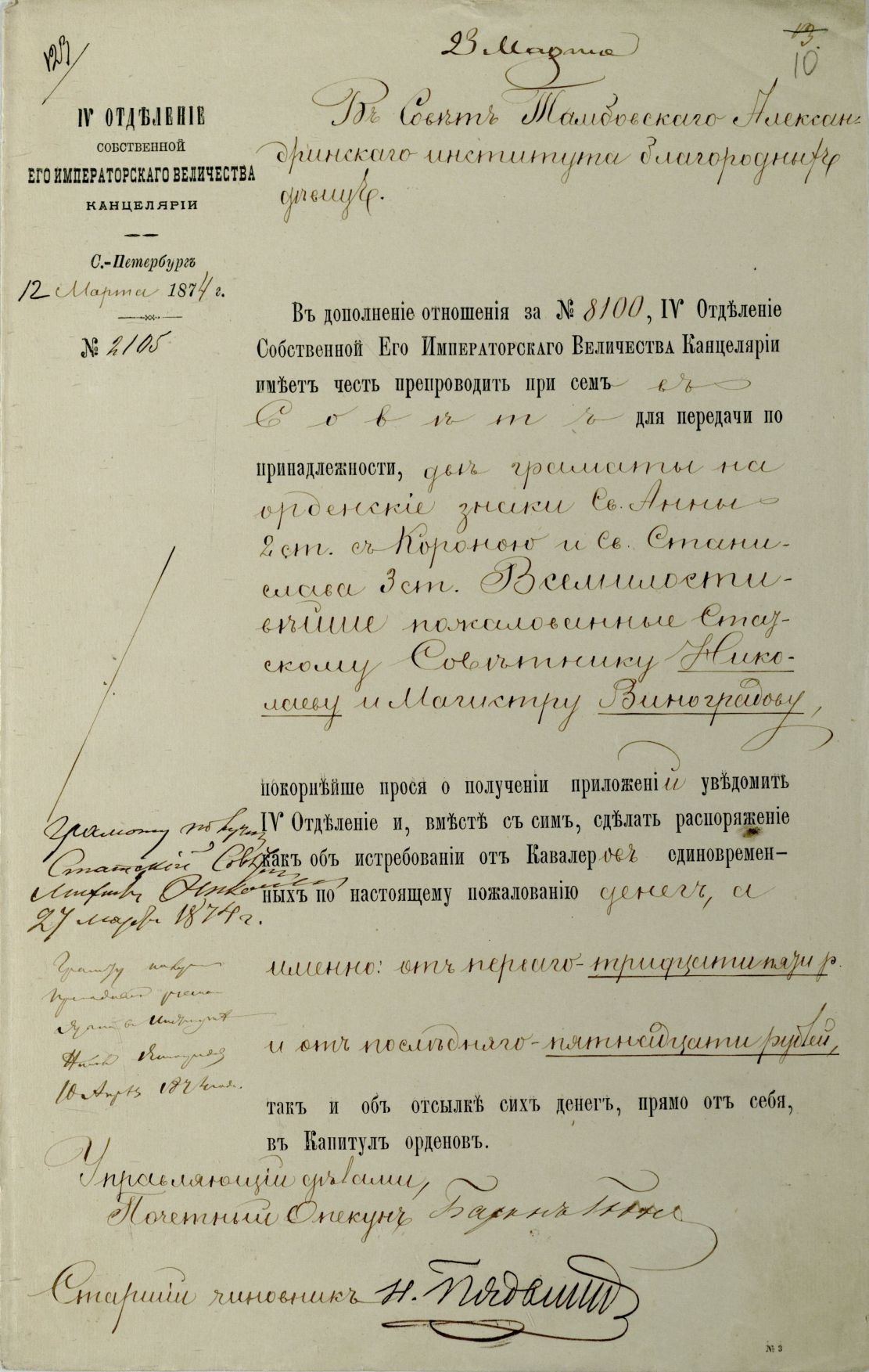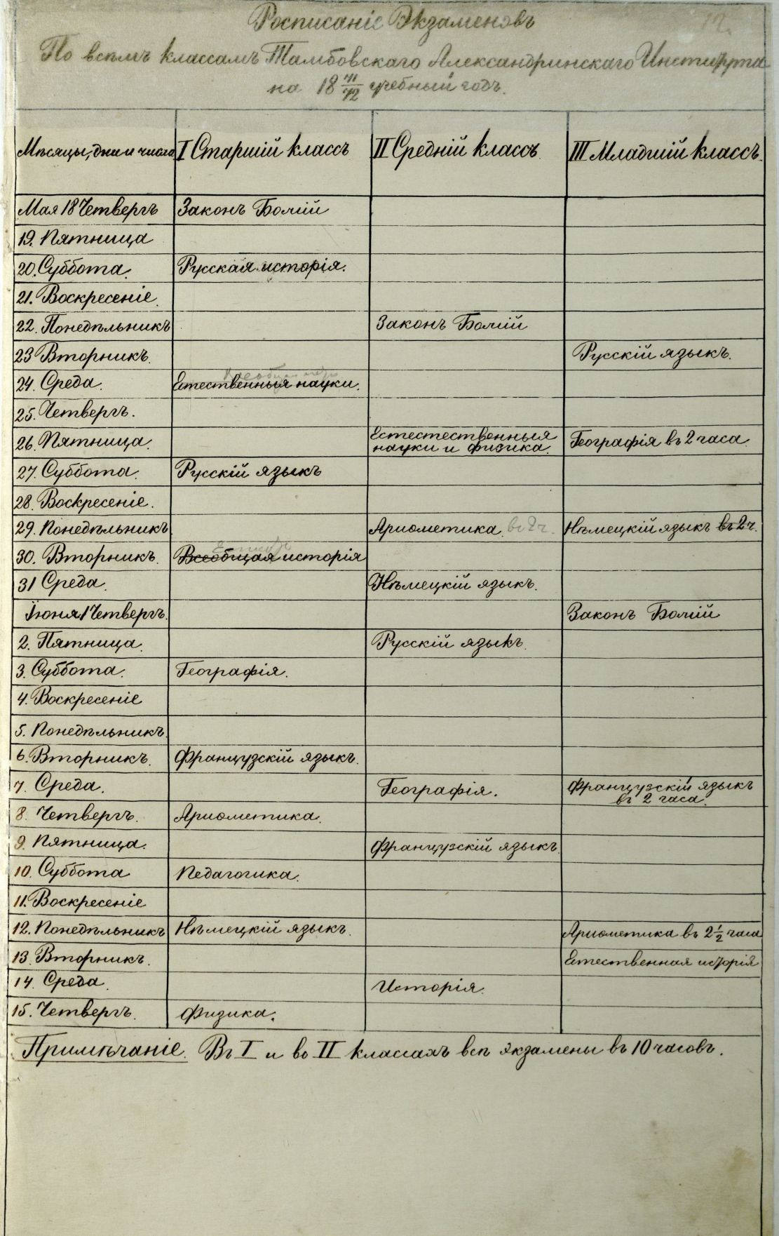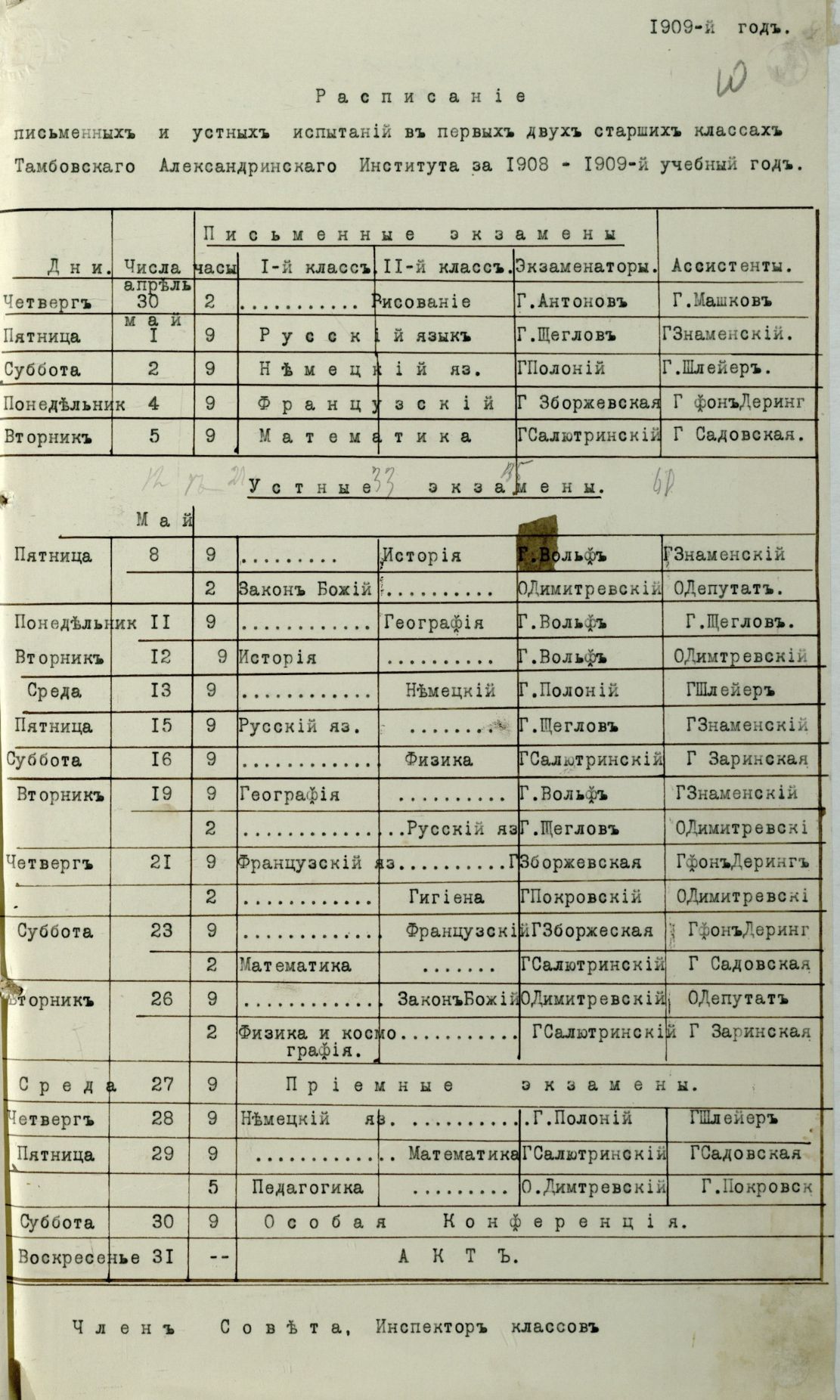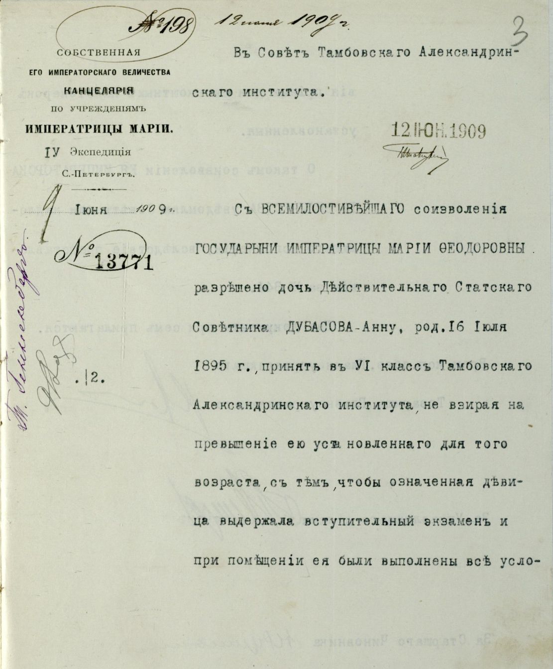 Тамбовский Александринский институт благородных девиц был основан по решению Тамбовского дворянского собрания, состоявшегося в 1834 году. Денежные средства для его учреждения должны были складываться из пожертвований дворян. Но от принятия решения до его воплощения – не короткий путь. Деньги собирались довольно долго, в течение шести лет. В 1836 году Тамбов посетил император Николай I и пожаловал в дар институту усадьбу старого губернаторского дома, который помнил ещё пребывание в нём правителя Тамбовского наместничества Гавриила Романовича Державина. Строительство института началось в 1840 году и закончилось только в 1843. Одновременно был разбит большой сад, в котором воспитанницы института могли гулять.