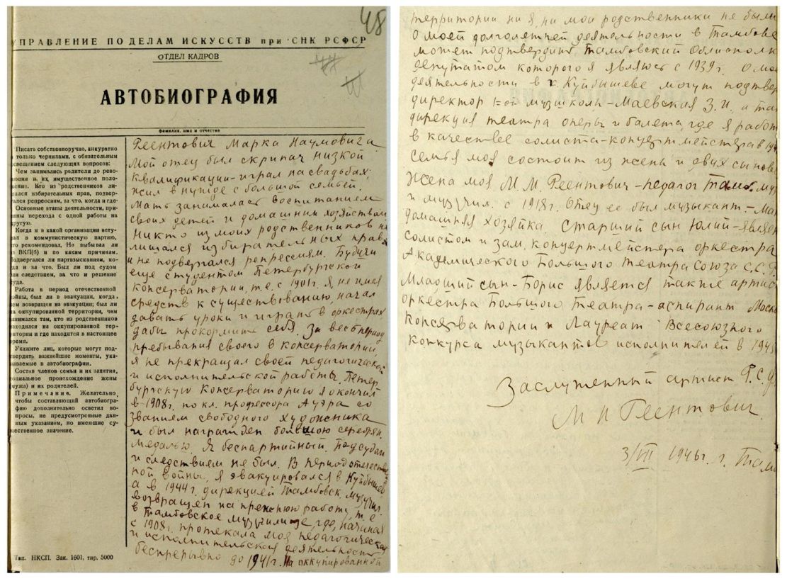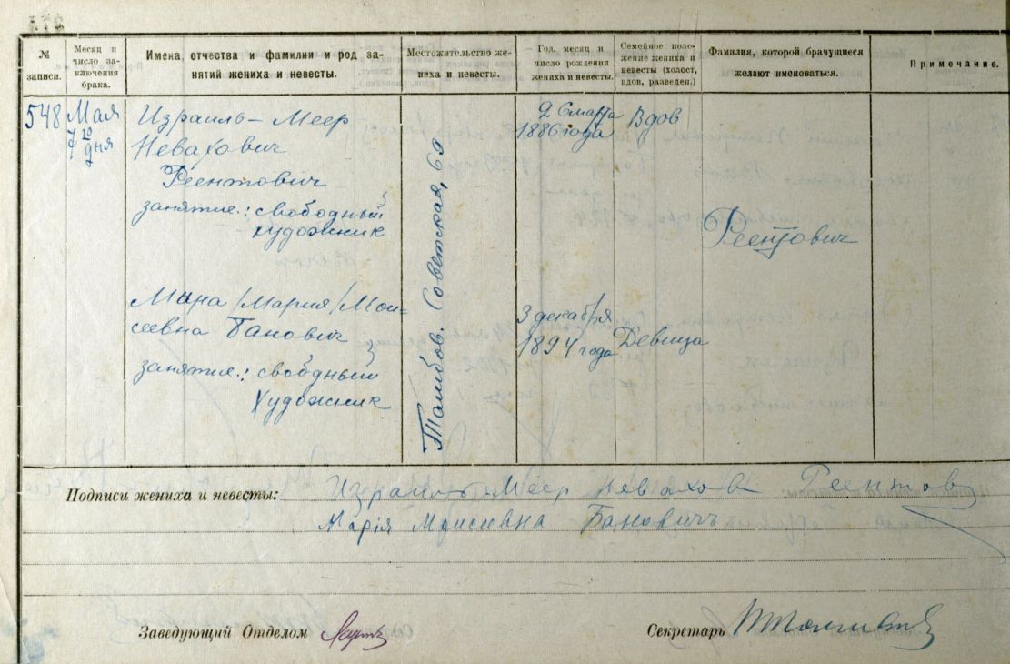 В Государственном архиве Тамбовской области в фонде «Коллекция книг записей актов гражданского состояния Тамбовской губернии» сохранилась запись о бракосочетании М.Н. Реентовича и М.М. Банович от 7 мая 1919 года, а в фонде Тамбовского музыкального училища имеется его личный листок по учету кадров и автобиография М.Н. Реентовича.