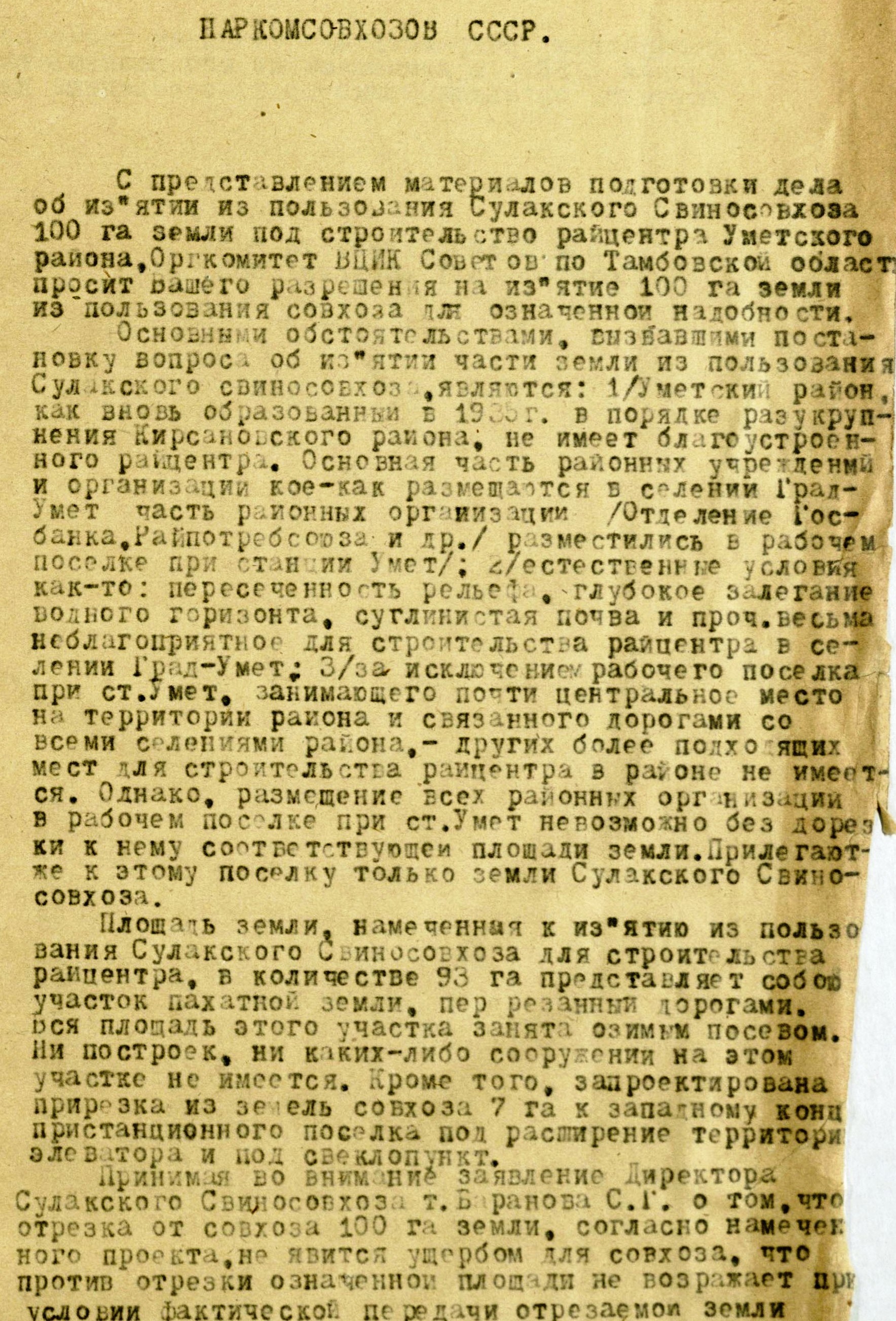 27 сентября 1937 года ЦИК СССР принял постановление о разделении Воронежской области на Тамбовскую с центром в г. Тамбове и Воронежскую с центром в г. Воронеже. Был образован Организационный комитет ВЦИК Советов по Тамбовской области, который решал все насущные вопросы. Трудный начальный период жизни самостоятельной Тамбовской области нашёл отражение в многочисленных архивных документах, освещающих развитие промышленности и сельского хозяйства, культуры и здравоохранения, народного образования и спорта.