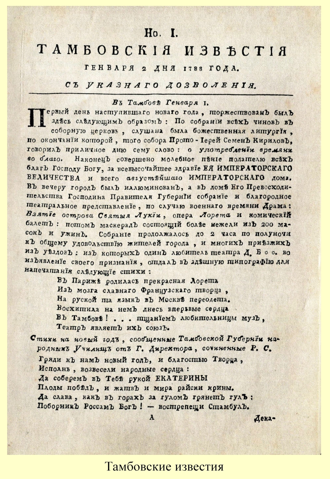 Всё началось с Державинских "Тамбовских известий» – первой провинциальной газеты, которая чудом сохранилась в полном комплекте – 52 номера за 1788 год – в фондах библиотеки Российского государственного архива древних актов. В 2012 году газета была переиздана репринтным способом в Издательском доме ТГУ им. Г.Р. Державина, теперь с ней может познакомиться любой желающий в библиотеке. Гавриил Романович Державин задумал издание газеты ещё в 1787 году, когда в Тамбове появилась первая вольная (т.е. частная) типография. Было объявлено о подписке для желающих получать еженедельные известия. Подписчиков набралось, видимо, достаточно, и 2 января 1788 года вышел первый номер газеты. "Тамбовские известия» были рассчитаны на зажиточные слои местного населения – дворянство и купечество, в них публиковались всевозможные объявления о купле-продаже, о ярмарках, о ценах на товары. Помещались на страницах газеты и сообщения о событиях, произошедших в Тамбове и в наместничестве, о повседневной жизни, о приезжающих и отъезжающих из Тамбова представителях дворянского сословия, чиновниках. Читатель мог найти в газете и полезные советы по ведению домашнего хозяйства. Для современного исследователя "Тамбовские известия» – живое свидетельство державинской эпохи.