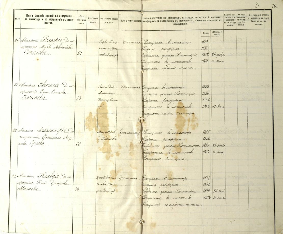 К 1913 году в Тамбовской губернии насчитывалось 30 монастырей и общин. К сожалению, до наших дней дошло немного документов, раскрывающих деятельность тамбовских монастырей, но и то, что сохранилось в различных архивных фондах, в том числе в фонде Тамбовской духовной консистории и в фондах монастырей, даёт достаточно цельную картину монастырской жизни. В Государственном архиве Тамбовской области хранятся документальные фонды Козловского Троицкого мужского монастыря, Елецкого Троицкого монастыря, Тамбовского Иоанно-Предтеченского Трегуляевского монастыря, Кирсановского Оржевского Боголюбского женского монастыря. Мы представляем вашему вниманию выставку документов, рассказывающую о некоторых эпизодах жизни тамбовских монастырей. Ряд фотографий извлечён из личного фонда В.А. Кученковой, много лет изучавшей историю Тамбовской епархии.