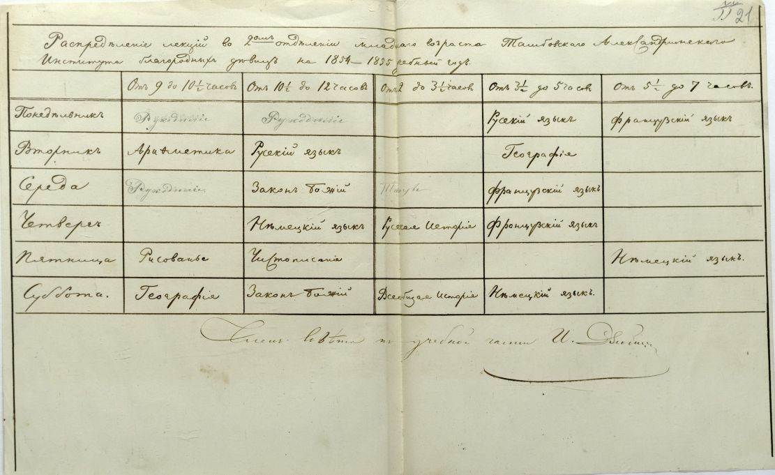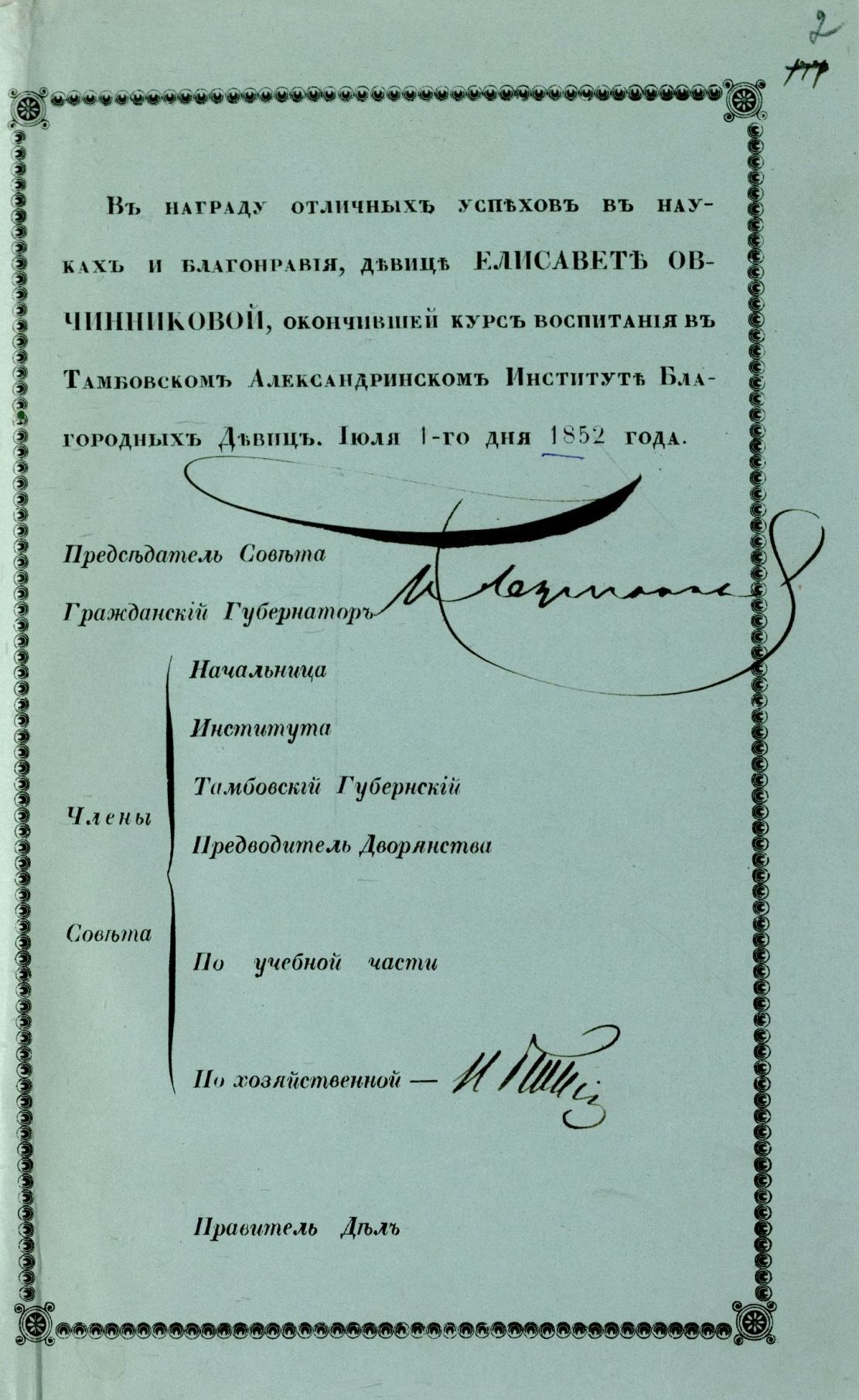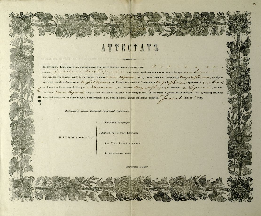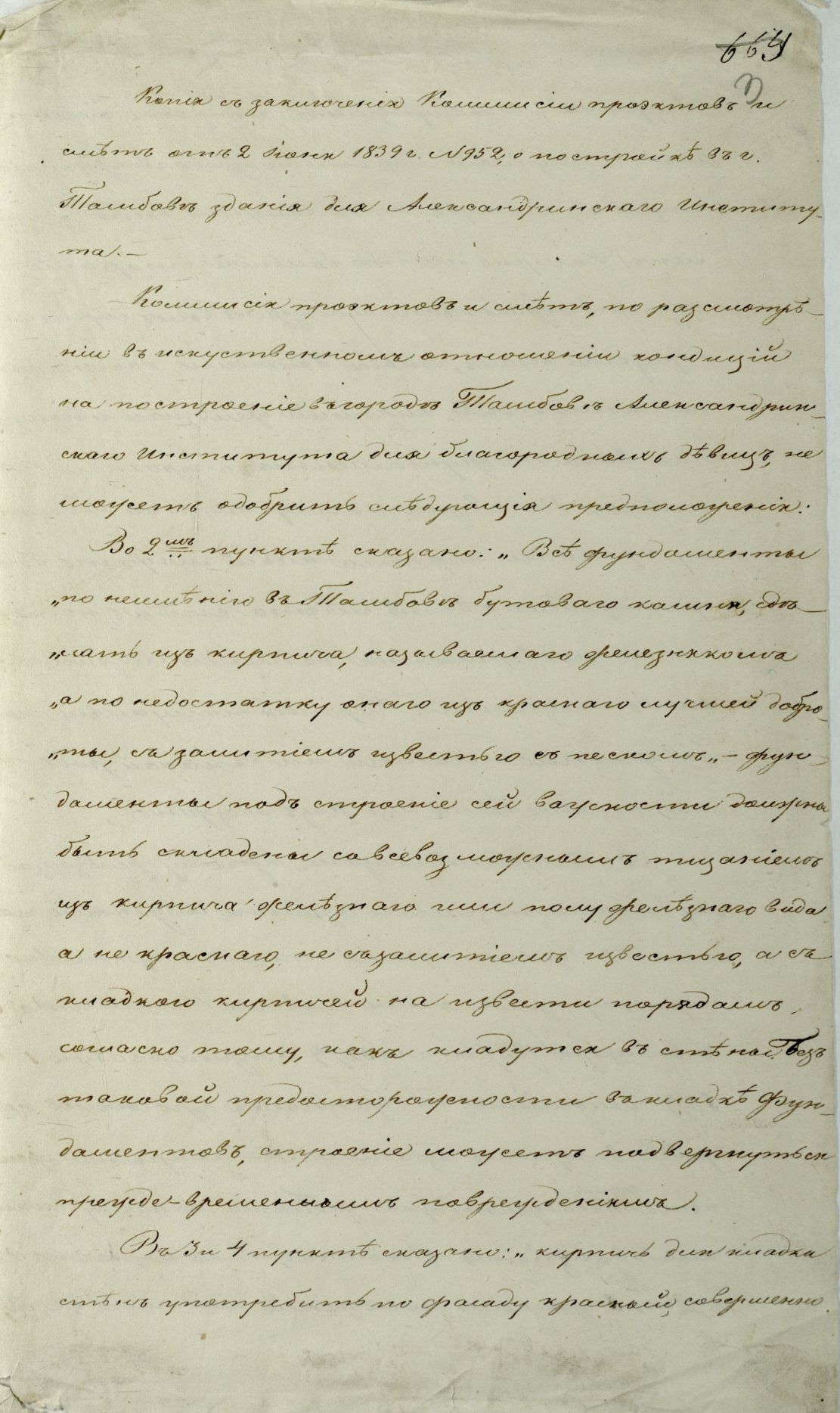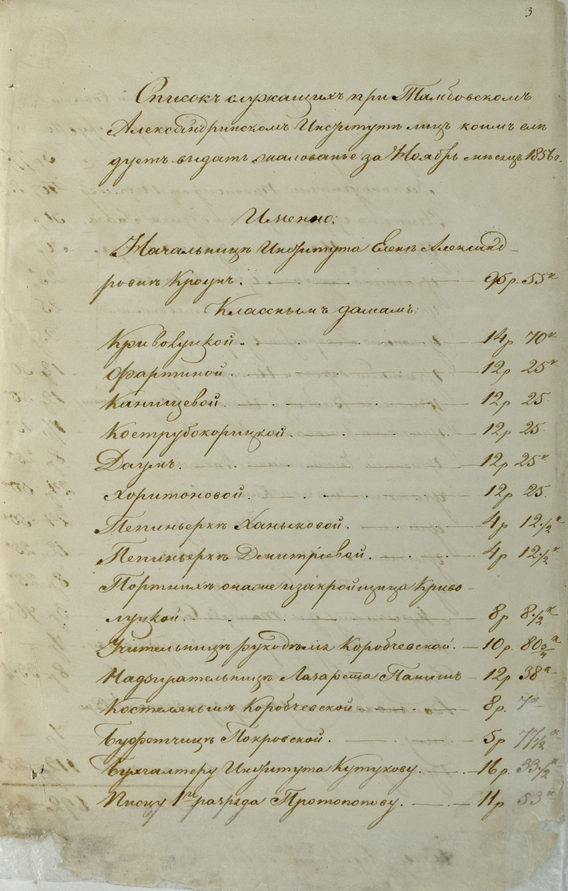 Тамбовский Александринский институт благородных девиц был основан по решению Тамбовского дворянского собрания, состоявшегося в 1834 году. Денежные средства для его учреждения должны были складываться из пожертвований дворян. Но от принятия решения до его воплощения – не короткий путь. Деньги собирались довольно долго, в течение шести лет. В 1836 году Тамбов посетил император Николай I и пожаловал в дар институту усадьбу старого губернаторского дома, который помнил ещё пребывание в нём правителя Тамбовского наместничества Гавриила Романовича Державина. Строительство института началось в 1840 году и закончилось только в 1843. Одновременно был разбит большой сад, в котором воспитанницы института могли гулять.