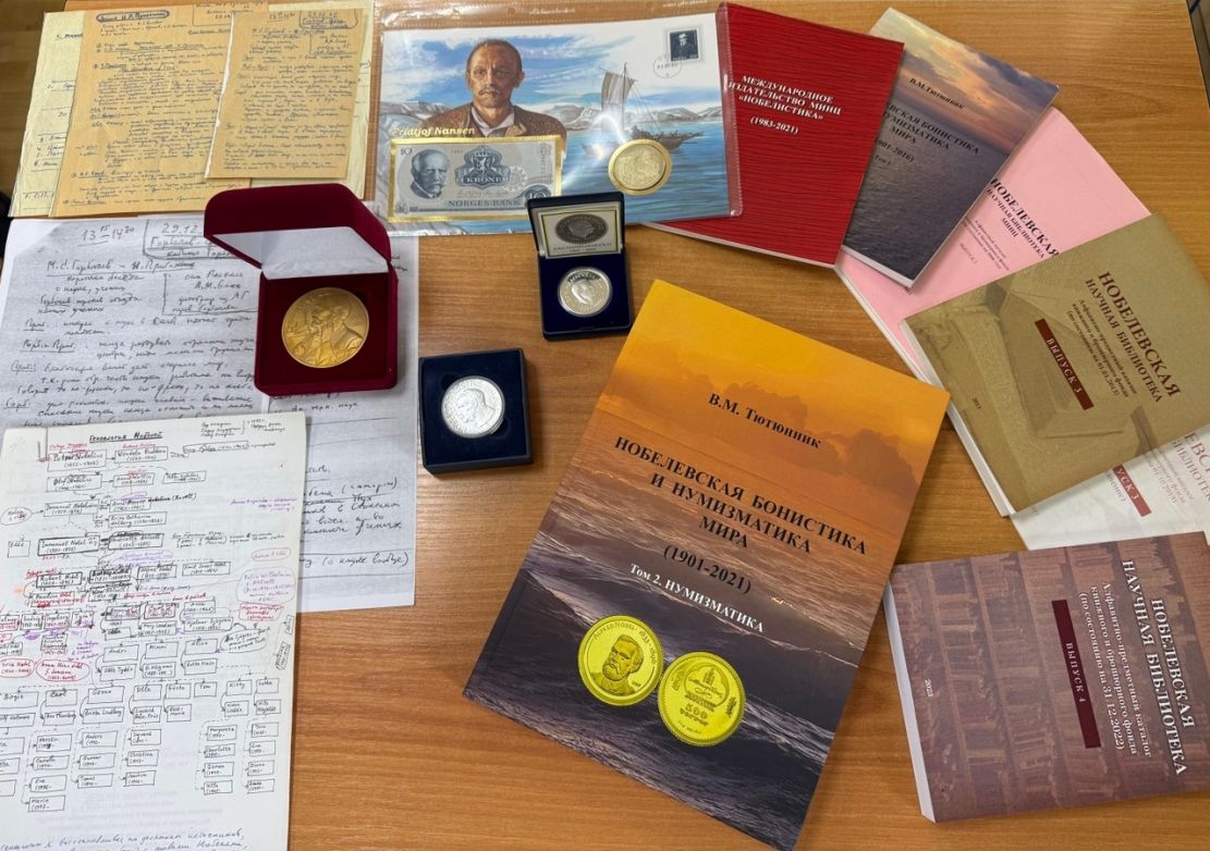 Демонстрируя первый проспект с программными положениями МИНЦ; каталог Нобелевской научной библиотеки (с дополнениями); указатели нобелевской бонистики и нумизматики; каталоги конвертов, медалей и орденов, выпущенных в честь нобелевских лауреатов из коллекции Музея МИНЦ; списки телепередач со своим участием, посвященных нобелевской тематике; рукописный вариант генеалогического древа семейства Нобелей, начатого еще в 2000 г. и составляющегося до настоящего времени; переписку; многочисленные фотографии и др., Вячеслав Михайлович рассказывал и об истории МИНЦ, и о составе фонда Нобелевской научной библиотеки, и об экспонатах и документах Музея и Архива семейства Нобелей и лауреатов Нобелевских премий, и об издательстве «Нобелистика», и о международных научных нобелевских конгрессах, проводимых в нашем городе на протяжении нескольких десятков лет, в которых принимают участие ученые из разных стран мира.
